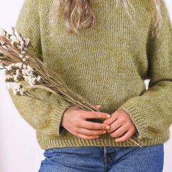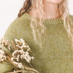 De Linn Sweater wordt naadloos van boven naar beneden gebreid. De twisted rib halsboord wordt eerst gebreid, dubbelgeslagen en vastgezet naar de verkeerde kant. Daarna werk je verder met raglanmeerderingen. Het rugpand wordt gevormd met de German Short Row techniek. Het lijf en de mouwen worden in het rond gebreid en beide afgewerkt met twisted rib boorden.