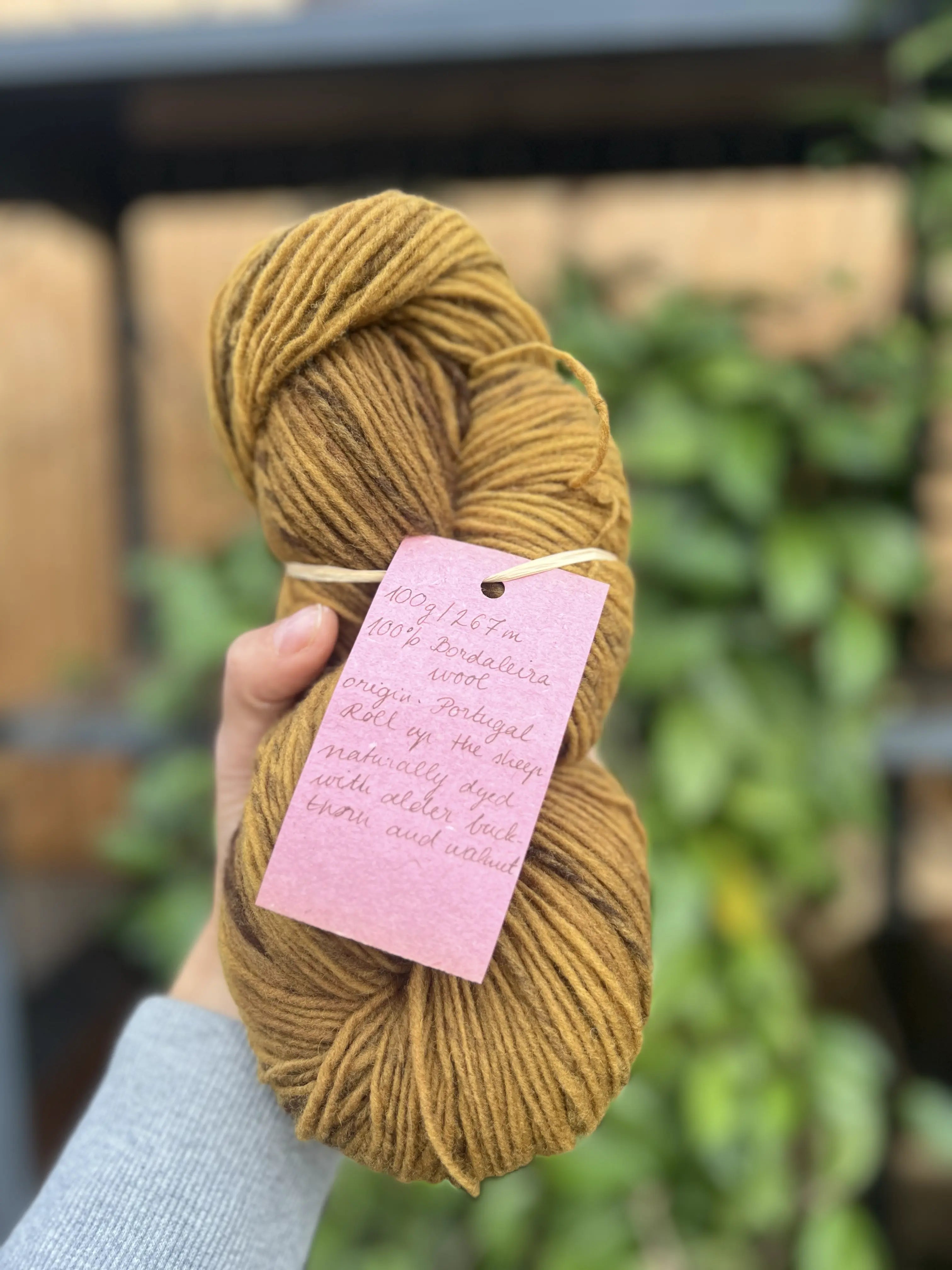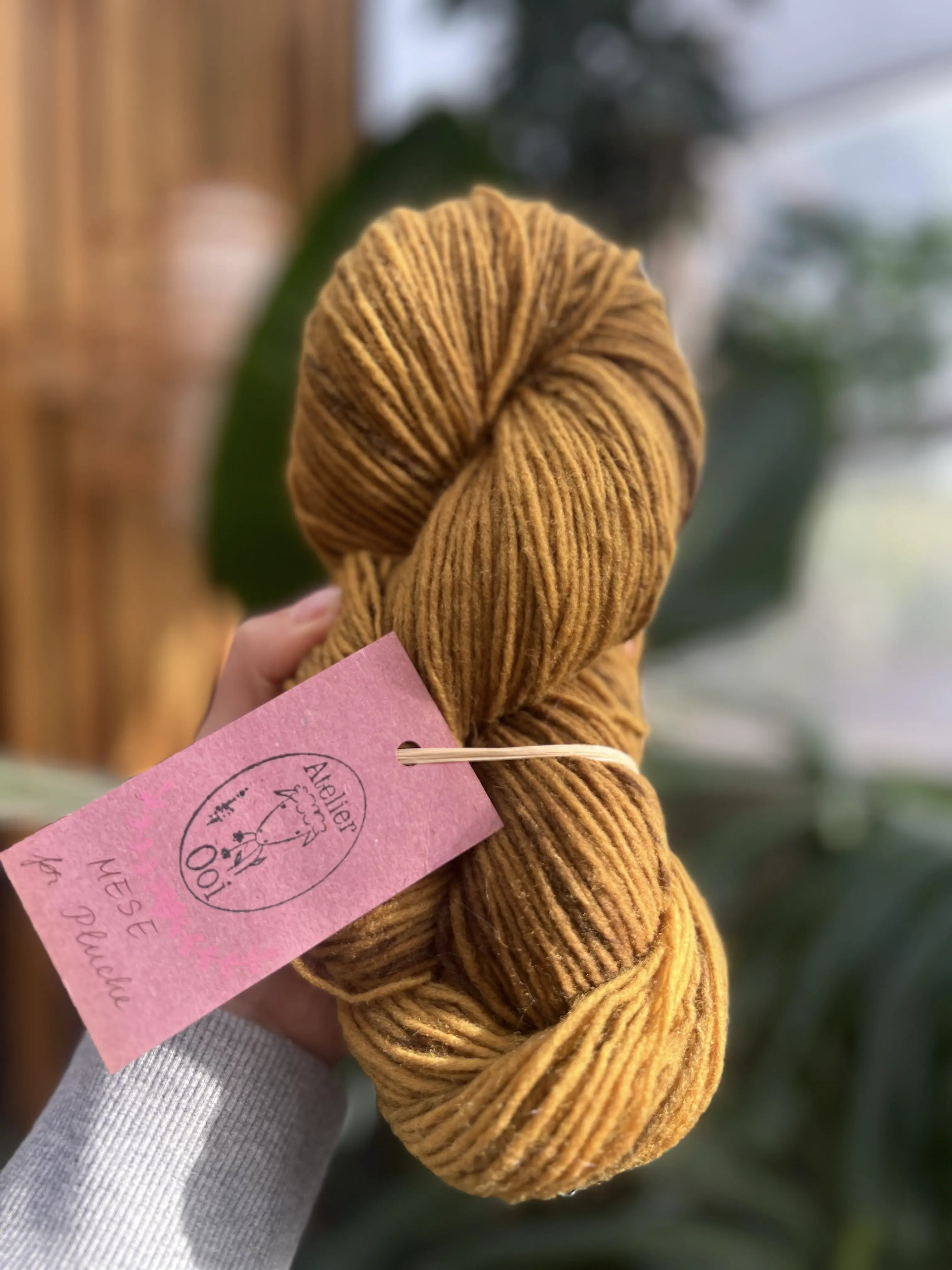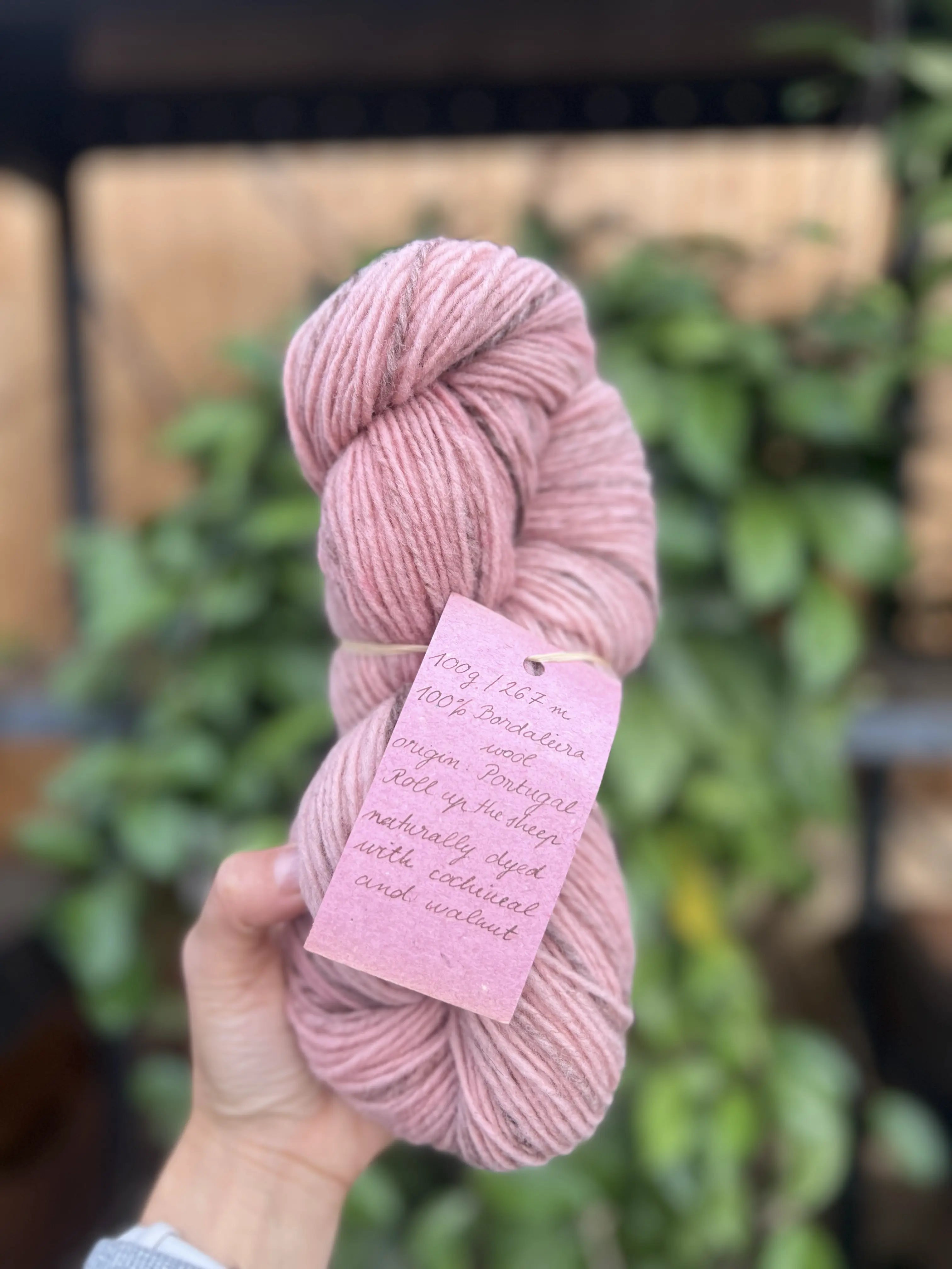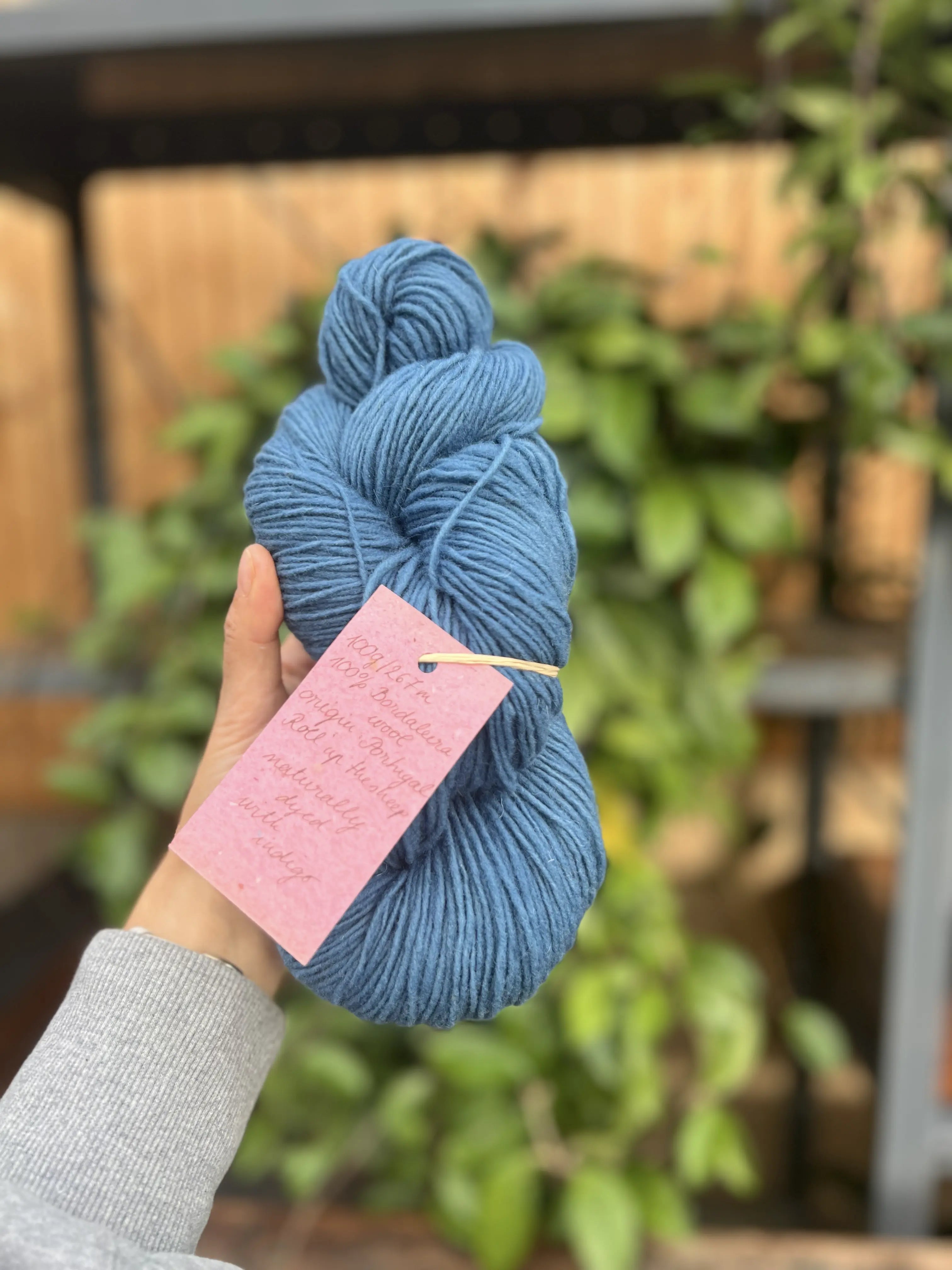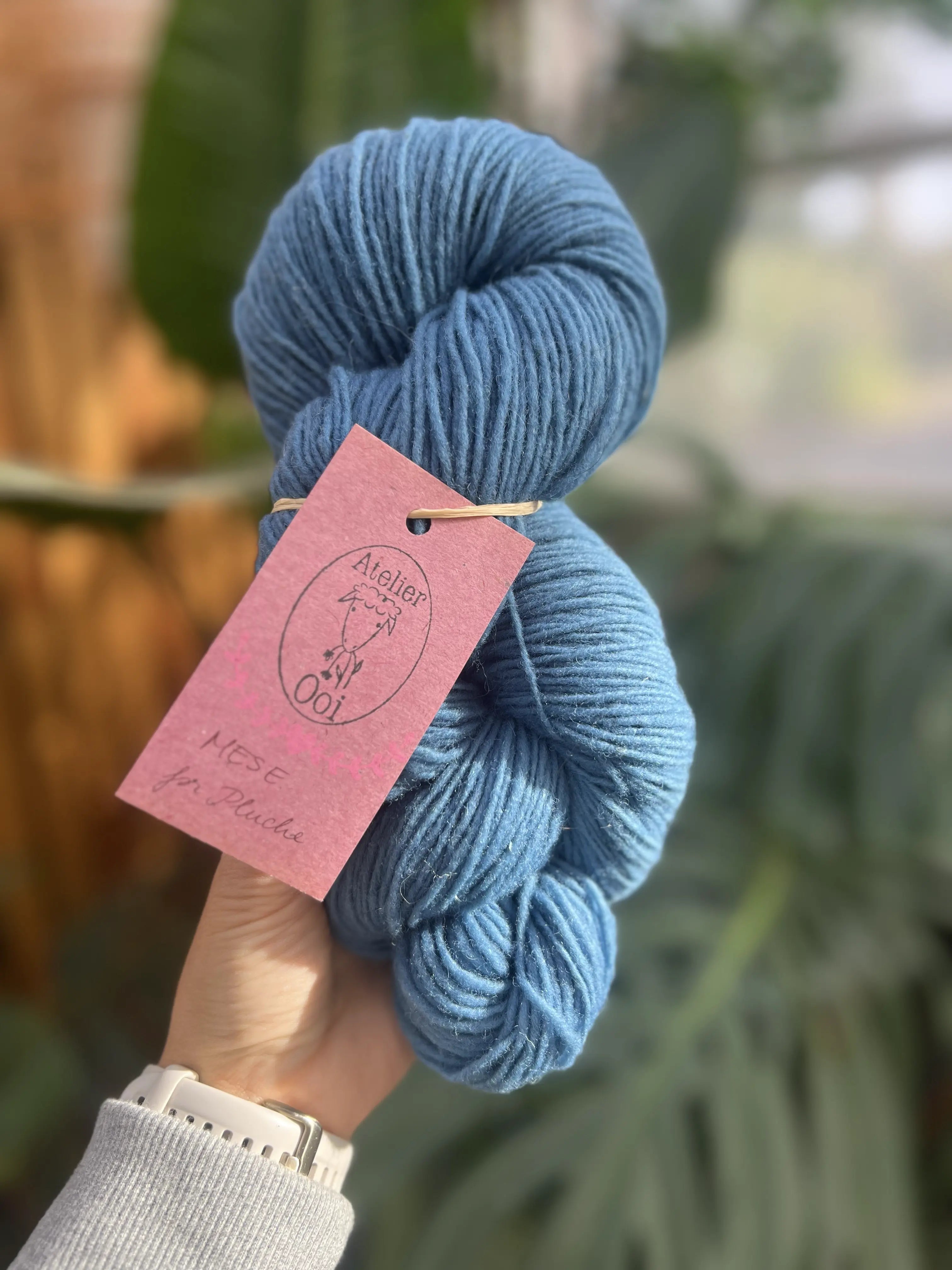 Mese van Atelier Ooi — DK-garen van 100% Portugese Bordaleira-wol. Natuurlijk geverfd in Utrecht met indigo, cochenille, elzenbast en walnoot. Exclusief voor Pluche.