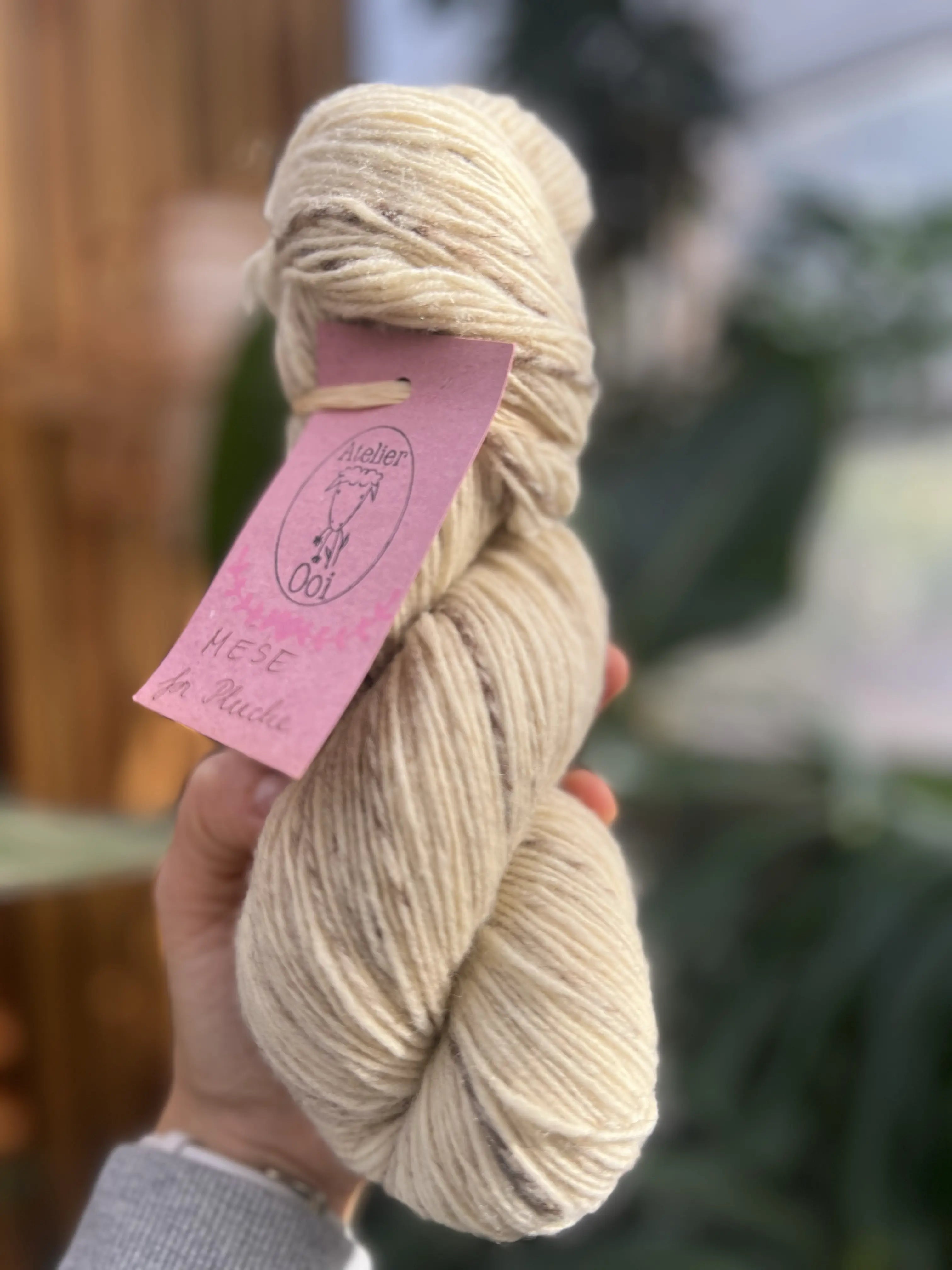Atelier Ooi ontstond na Julia’s verhuizing naar Nederland, gedreven door haar wens om haar wolreddingsmissie voort te zetten die jaren geleden in Hongarije begon. Haar droom is om op een dag een garen te creëren dat volledig is gesponnen van Nederlandse schapen — en zo de cirkel te sluiten tussen lokale kuddes en lokale breiers.