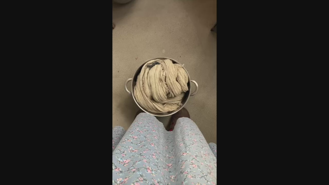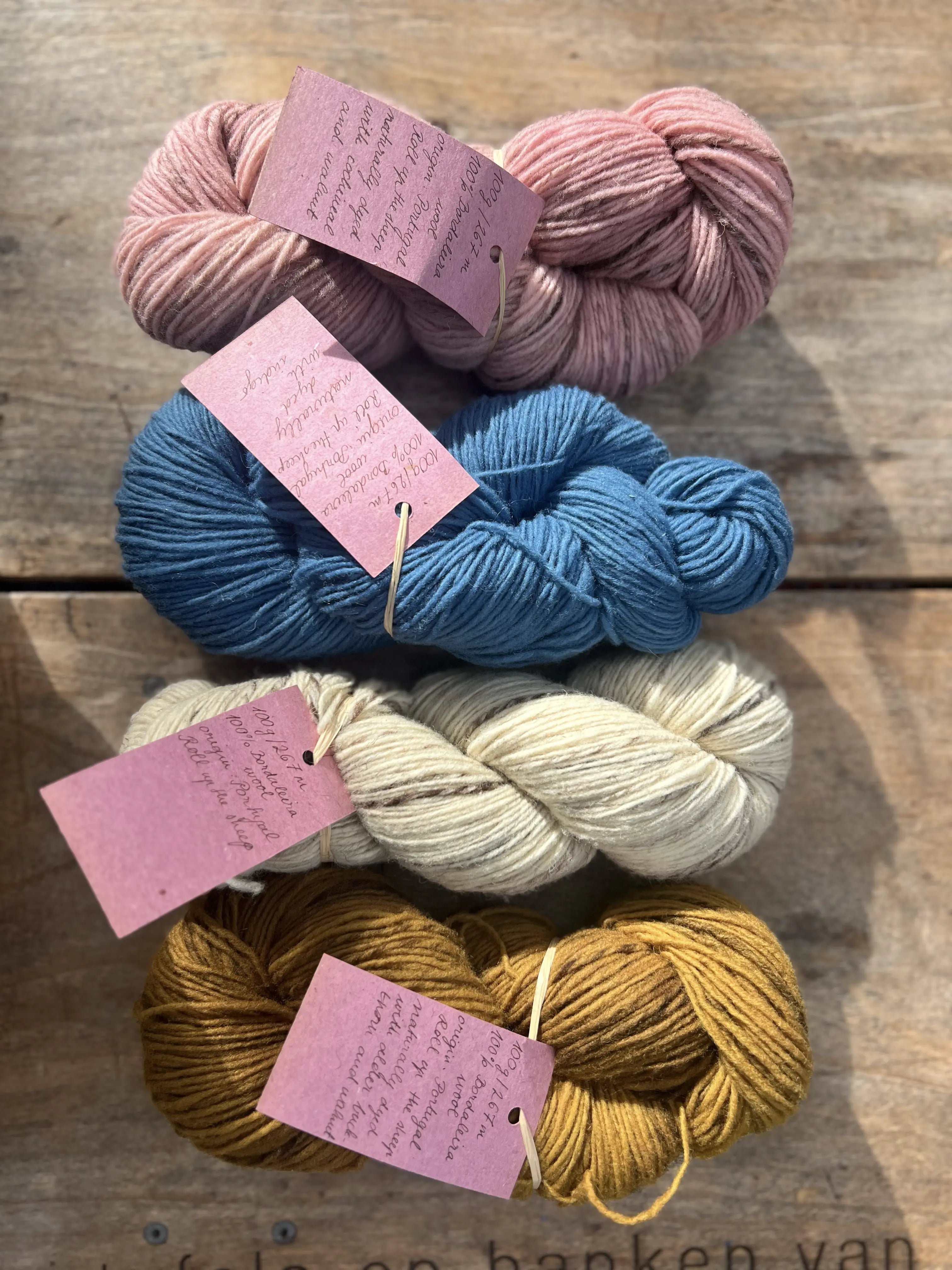 Van schors en bladeren tot levendige kleur: elke streng doorloopt een langzaam, handmatig proces — het voorbereiden van het verfbad, weken en beitsen, draaien en spoelen, drogen, en tot slot het labelen van elke streng één voor één. Het ritme van dit proces is rustig, precies en persoonlijk — je voelt bijna de warmte van Julia’s atelier in het eindresultaat.