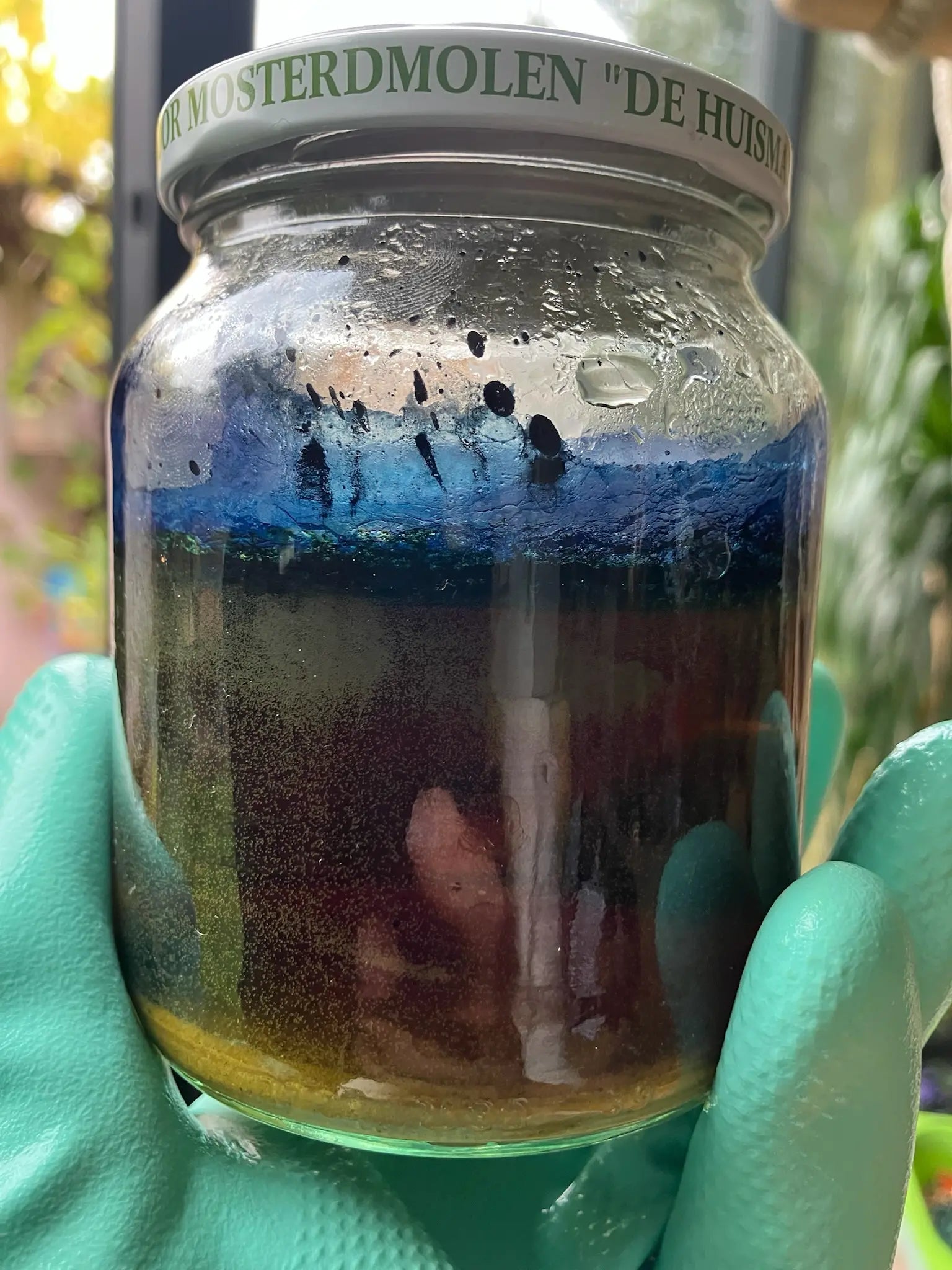 Julia zeeft het plantaardige materiaal en mengt de natuurlijke verf. De strengen worden voorzichtig ondergedompeld en nemen langzaam de kleur op.