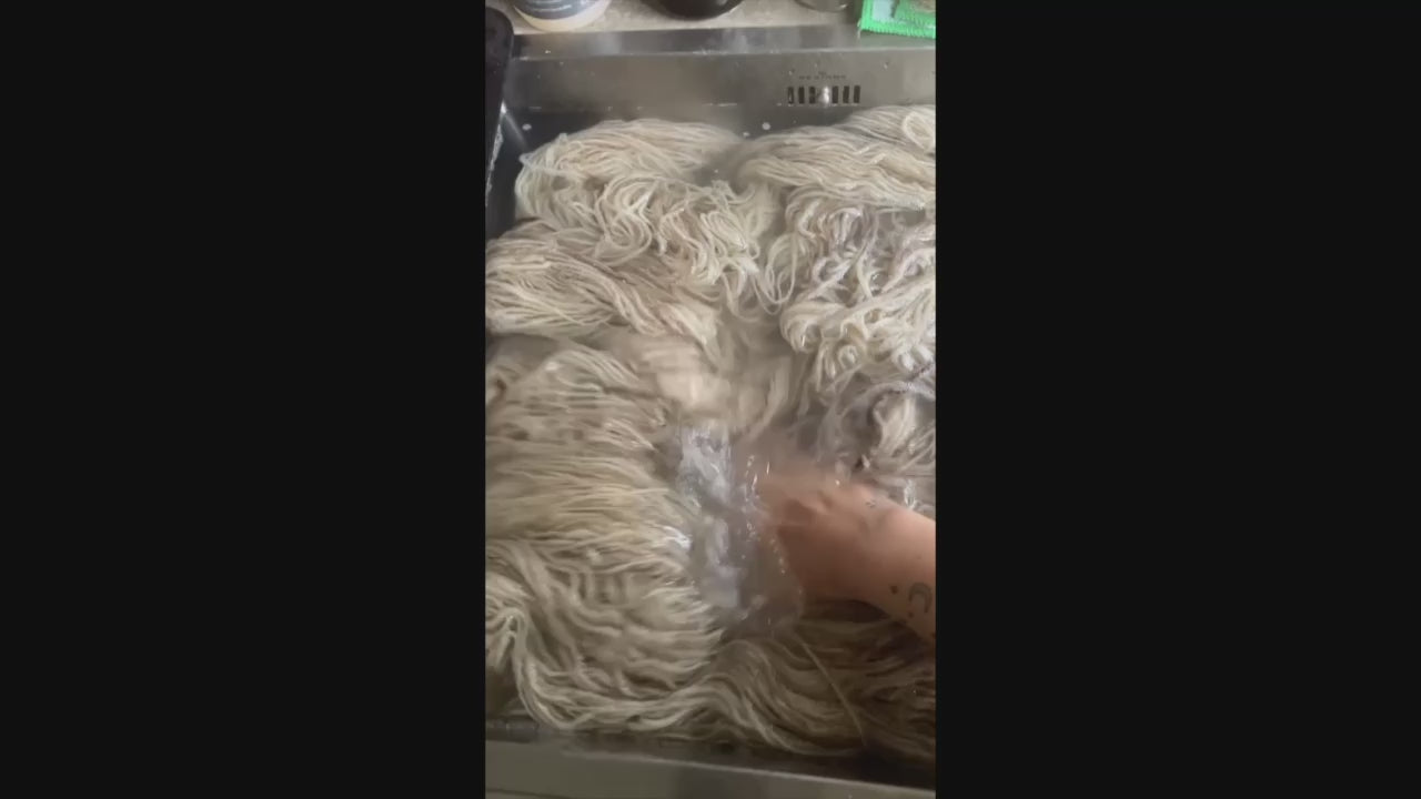 Na het verven wordt het garen met de hand uitgespoeld om overtollig water te verwijderen.