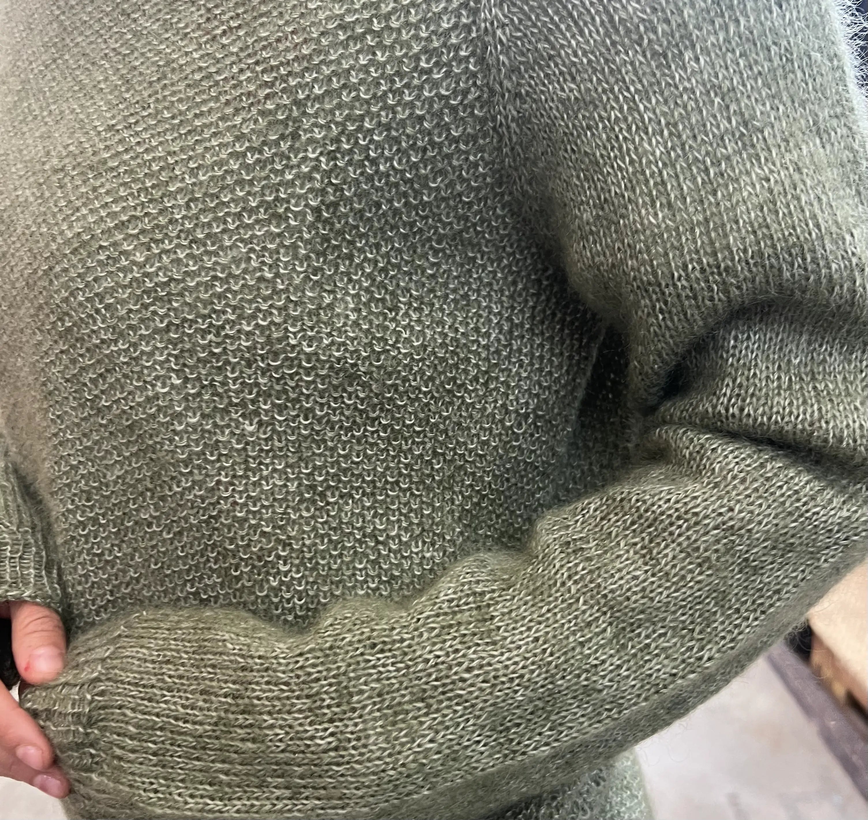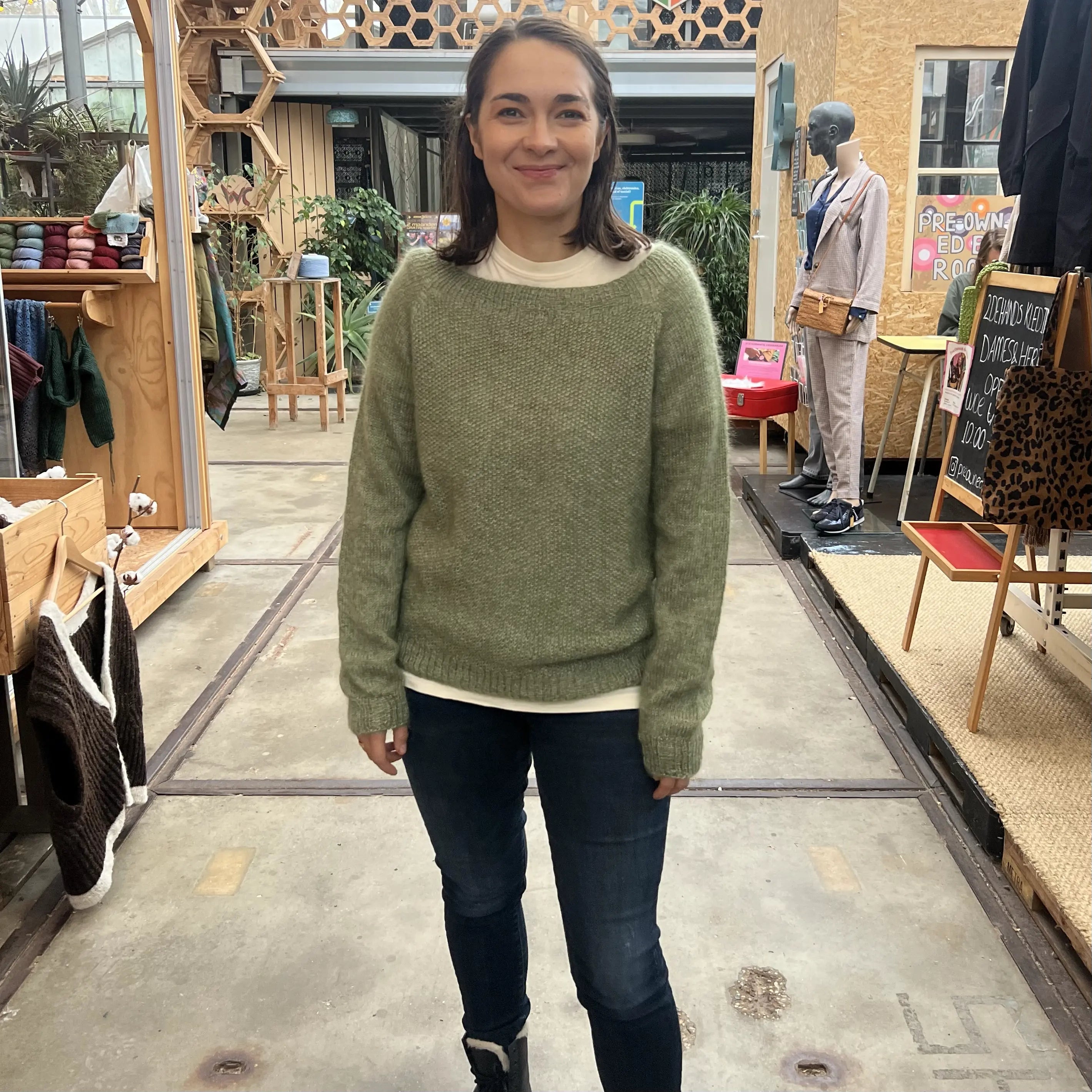 Brushed Lace in Tea Green(3023), Rustic Pink (3022), Taupe (3007) of Ice Blue (3012) gecombineerd met Kid Mohair 1 ply in White (3000). In de foto draag ik kleur Tea Green in maat M. - Het officiële patroon van Jane Kofoed – gedrukt én digitaal