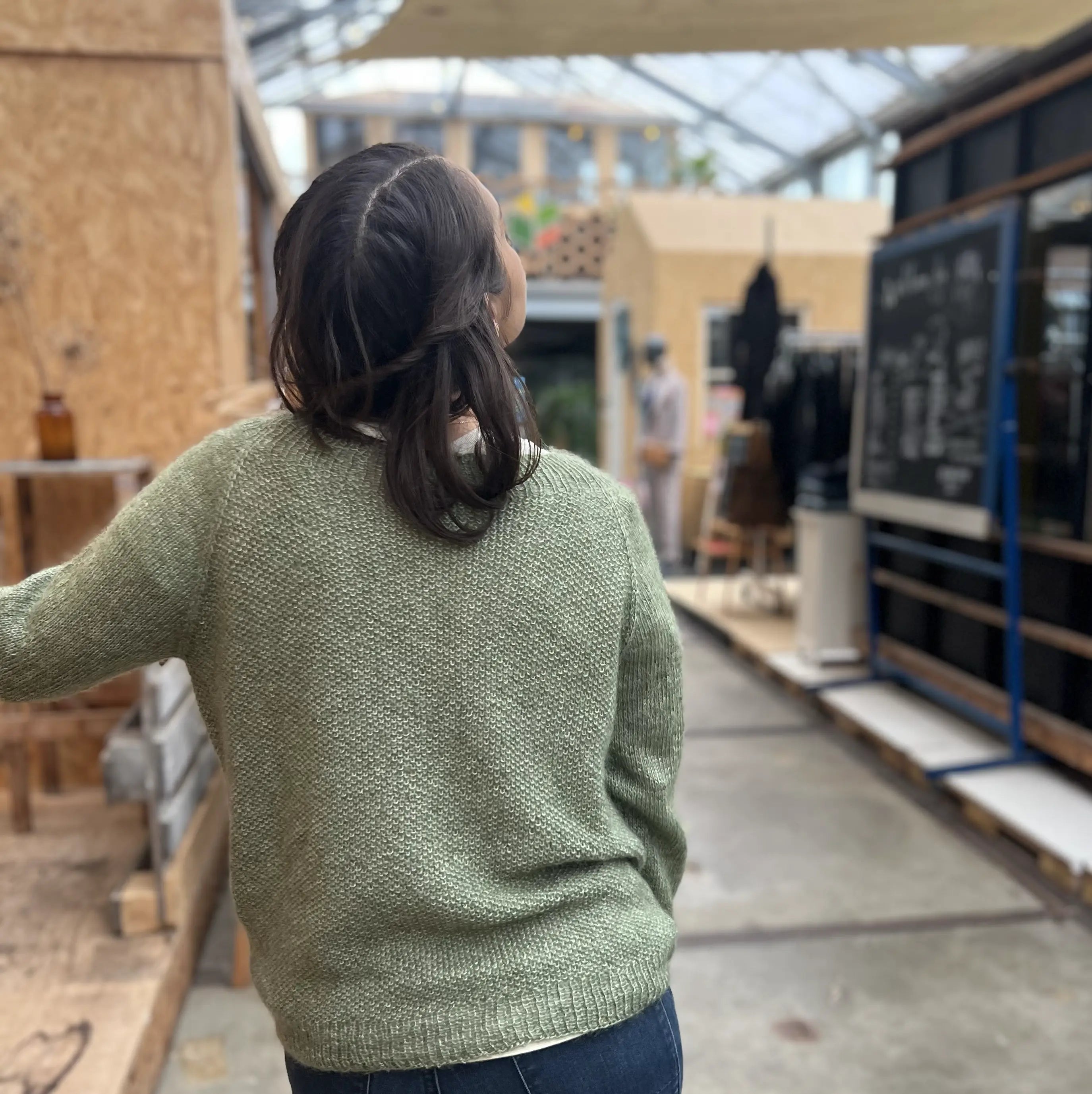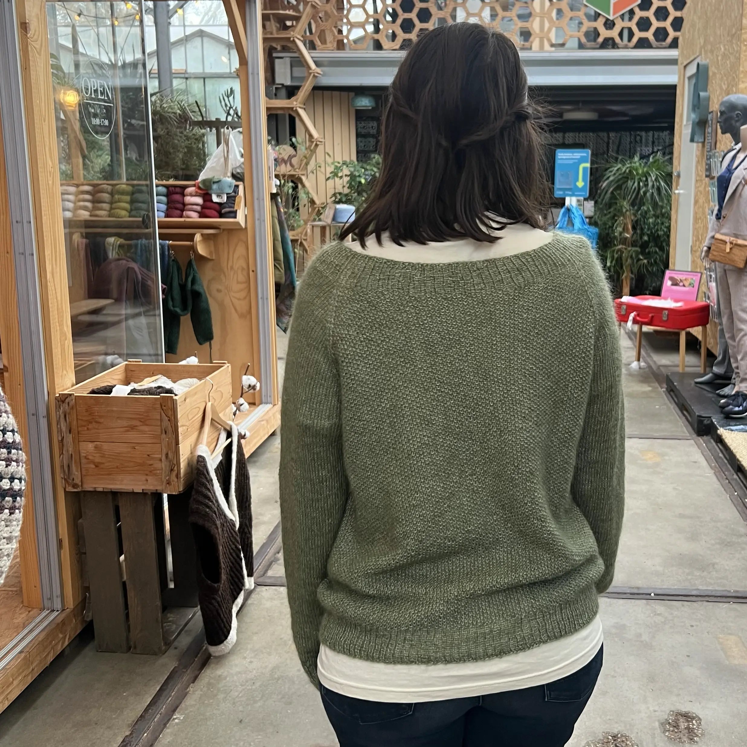 Moeilijkheid: eenvoudig te breien, met een rustig ritme in gerstekorrelpatroon en een elegante top-down raglanconstructie.